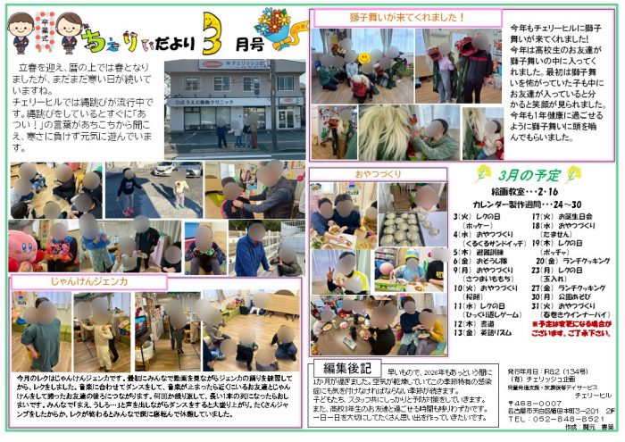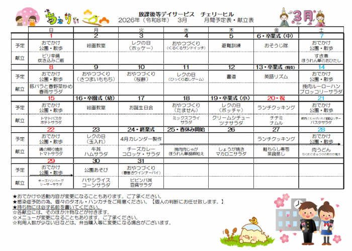あっという間3月ですね。高校3年生の利用者さんは高校卒業と共に、チェリーヒルも卒所されます。新しい場所でも、きっと活躍される卒業生をチェリーヒルからずっと応援しています😊
