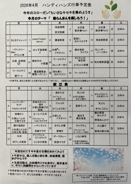 新年度が始まっています。ハンディハンズは利用者さんもスタッフもメンバー変わらず、いつもの毎日を過ごしています✨4月の行事予定表、年間行事予定表などなどです。