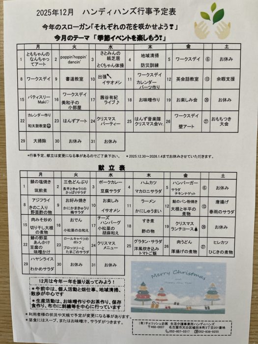 寒くなってきましたね〜❄️ おおくすの利用者さんは毎日元気いっぱいです! 今年もあとひと月。。。1年があっという間に感じます。毎日が充実してるからでしょうか😊 今月も楽しく過ごしましょう! 12月の予定表とおおくすだより […]